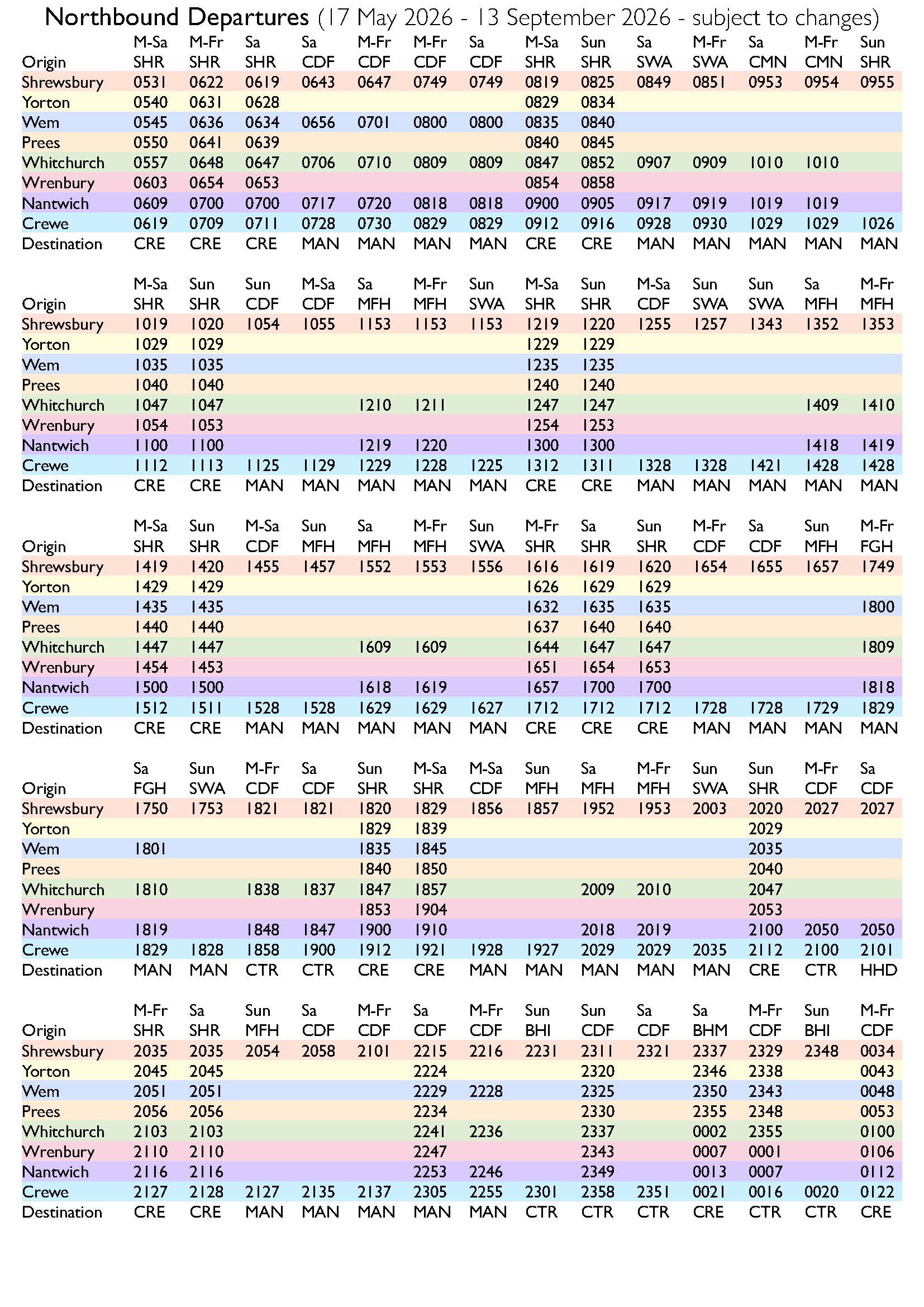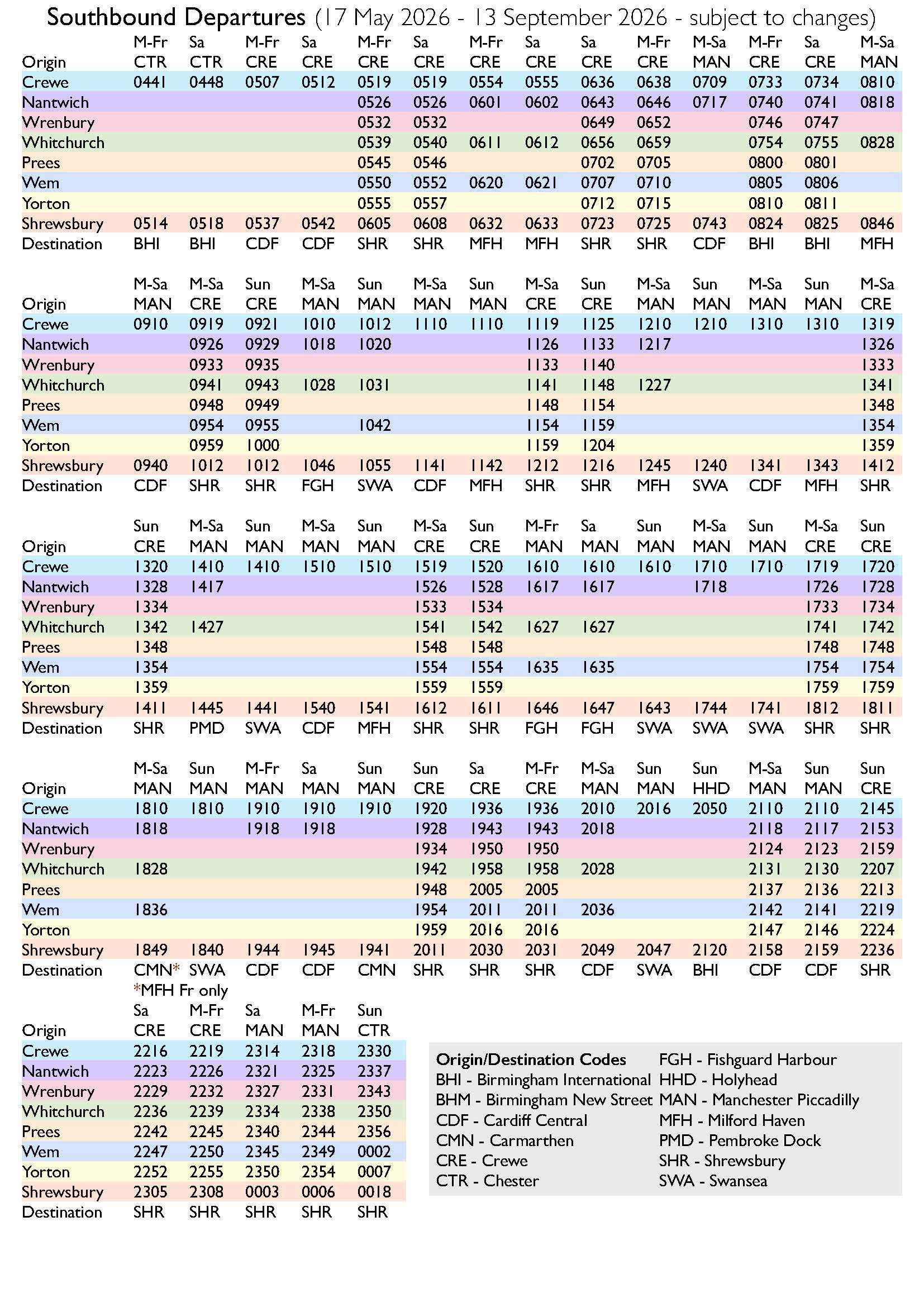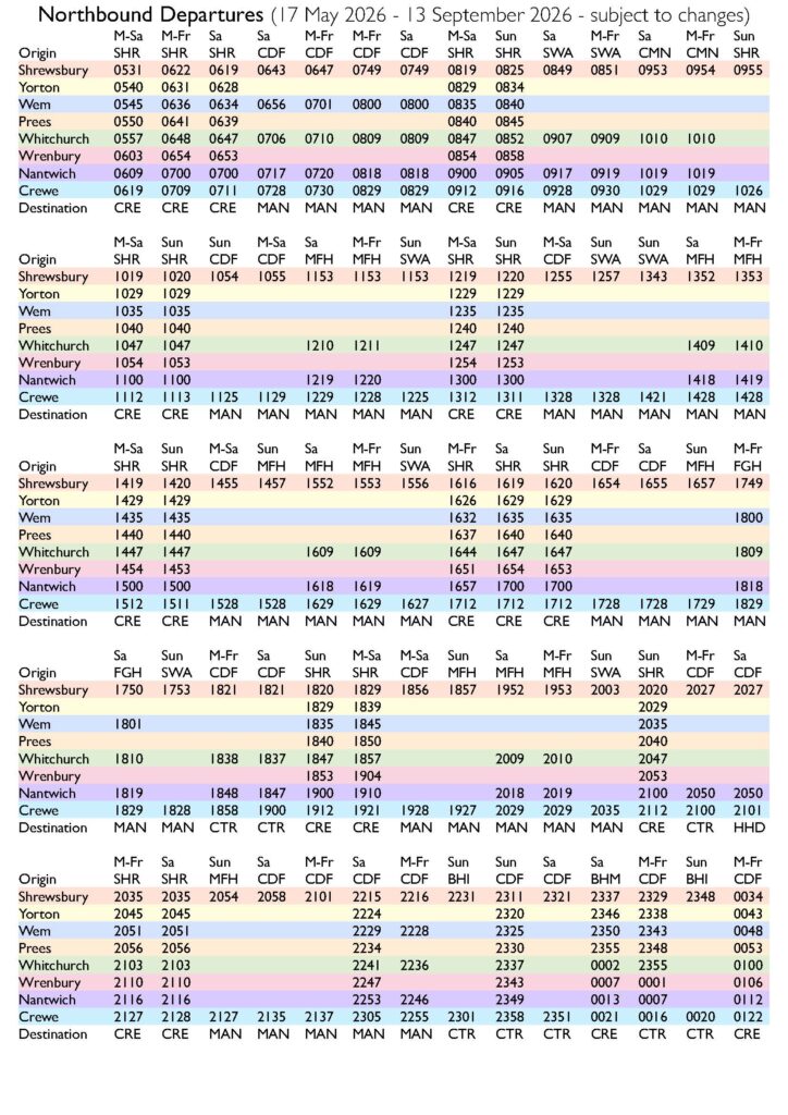 TfW timetables are changing from Sunday 2 June so please check before you travel. An overview of the most significant changes can be found on TfW web site here For us the change identified is 21:55 Cardiff – Crewe (Friday only) will now terminate Shrewsbury. With an additional service 00:17 Shrewsbury – Crewe. The new timetable booklet download is here: New timetables for June 2024
